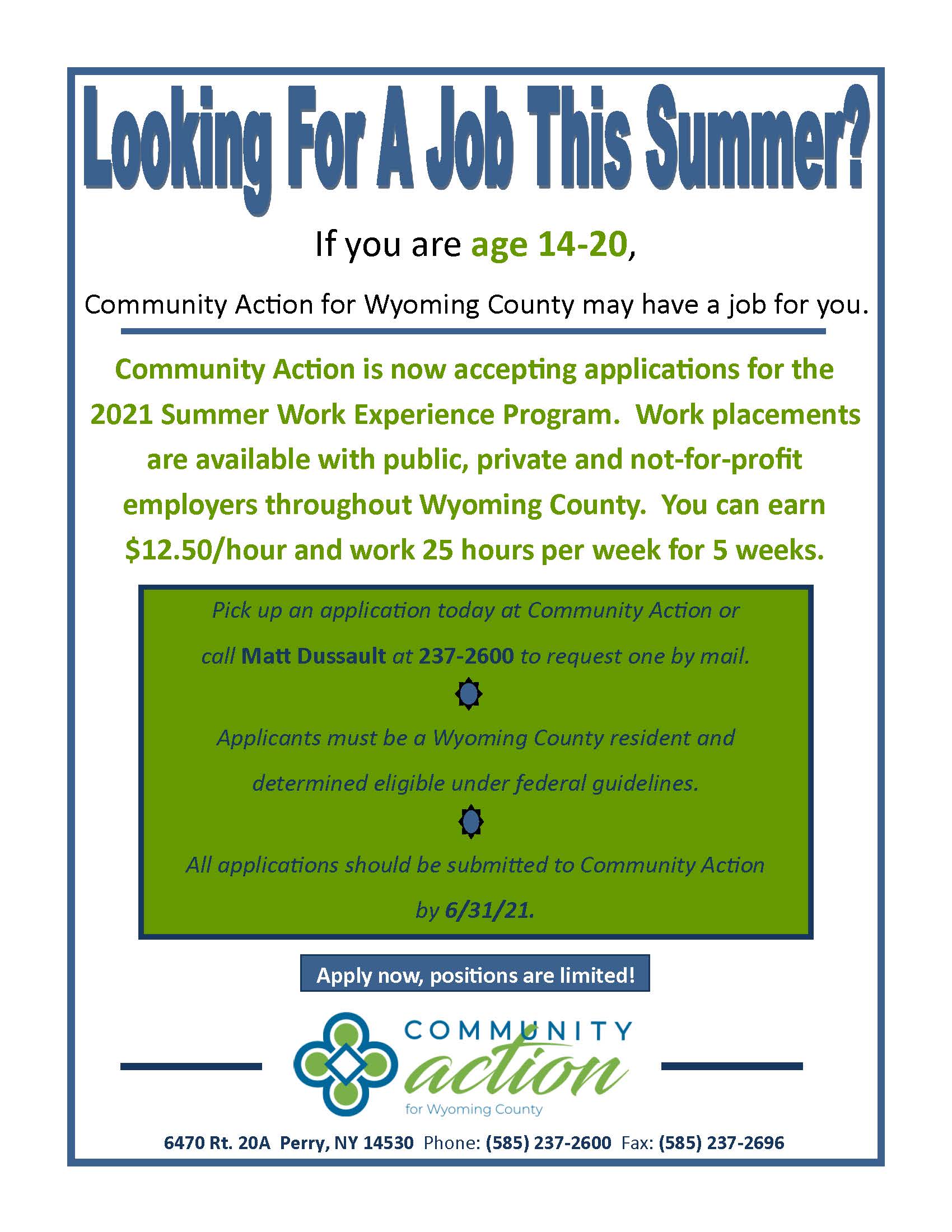 Work placements are available with public, private and not-for-profit employers throughout Wyoming County. You can earn $12.50/hour and work 25 hours per week for 5 weeks. Pick up an application today at Community Action or call Matt Dussault at 237-2600 to request one by mail. Applicants must be a Wyoming County resident and determined eligible under federal guidelines. All applications should be submitted to Community Action by 6/31/21. You can also download the application in the "Forms and Applications" section of the Agency website.
